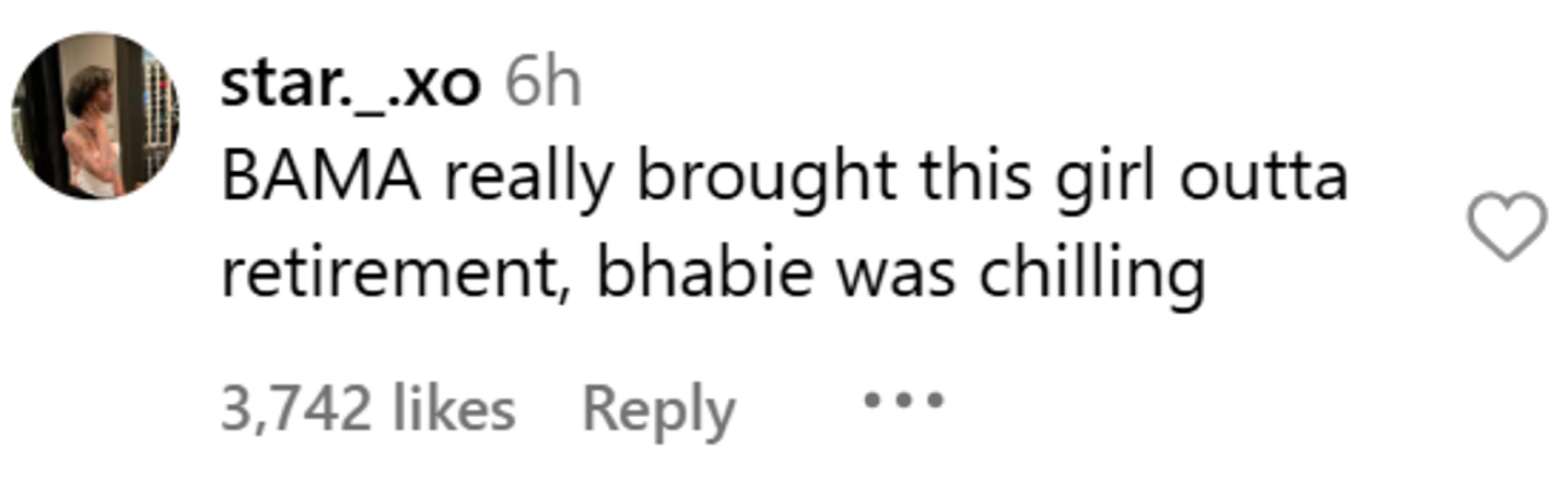 "BAMA really brought this girl outta retirement, bhabie was chilling," another user, @star._.xo, posted.
