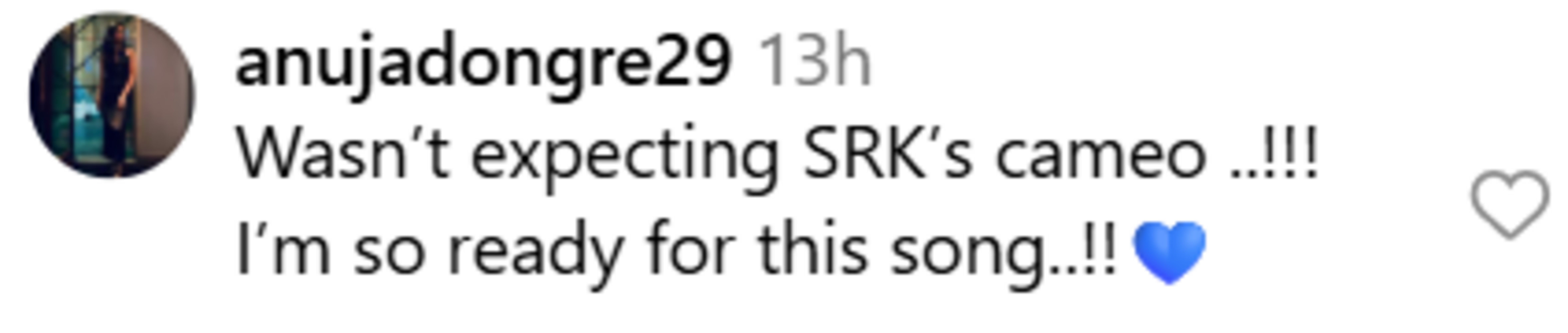 "Wasn’t expecting SRK’s cameo ..!!! I’m so ready for this song..!!💙," a user, @anujadongre29, commented.