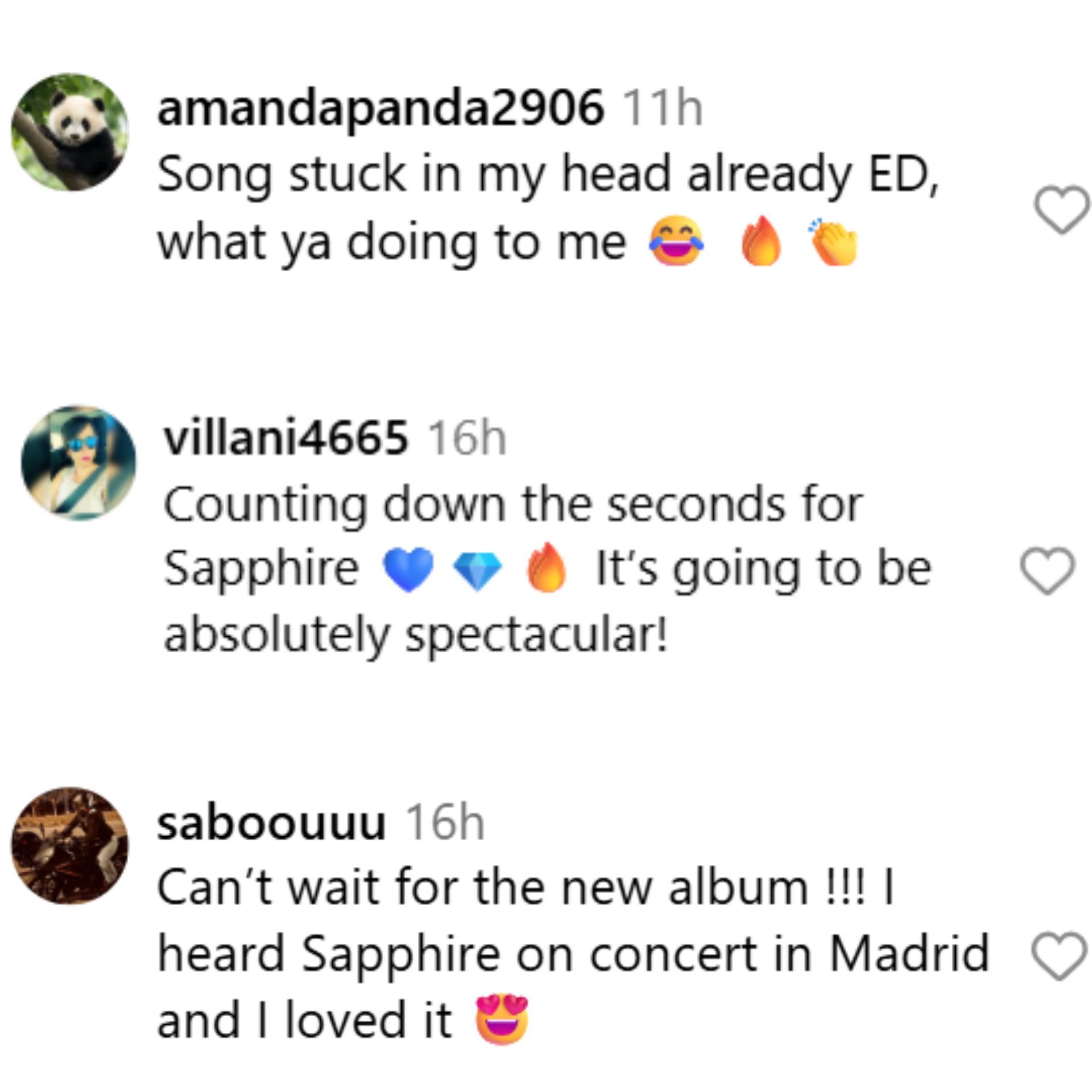 "Can’t wait for the new album !!! I heard Sapphire on concert in Madrid and I loved it 😍," one more user, @saboouuu, wrote.