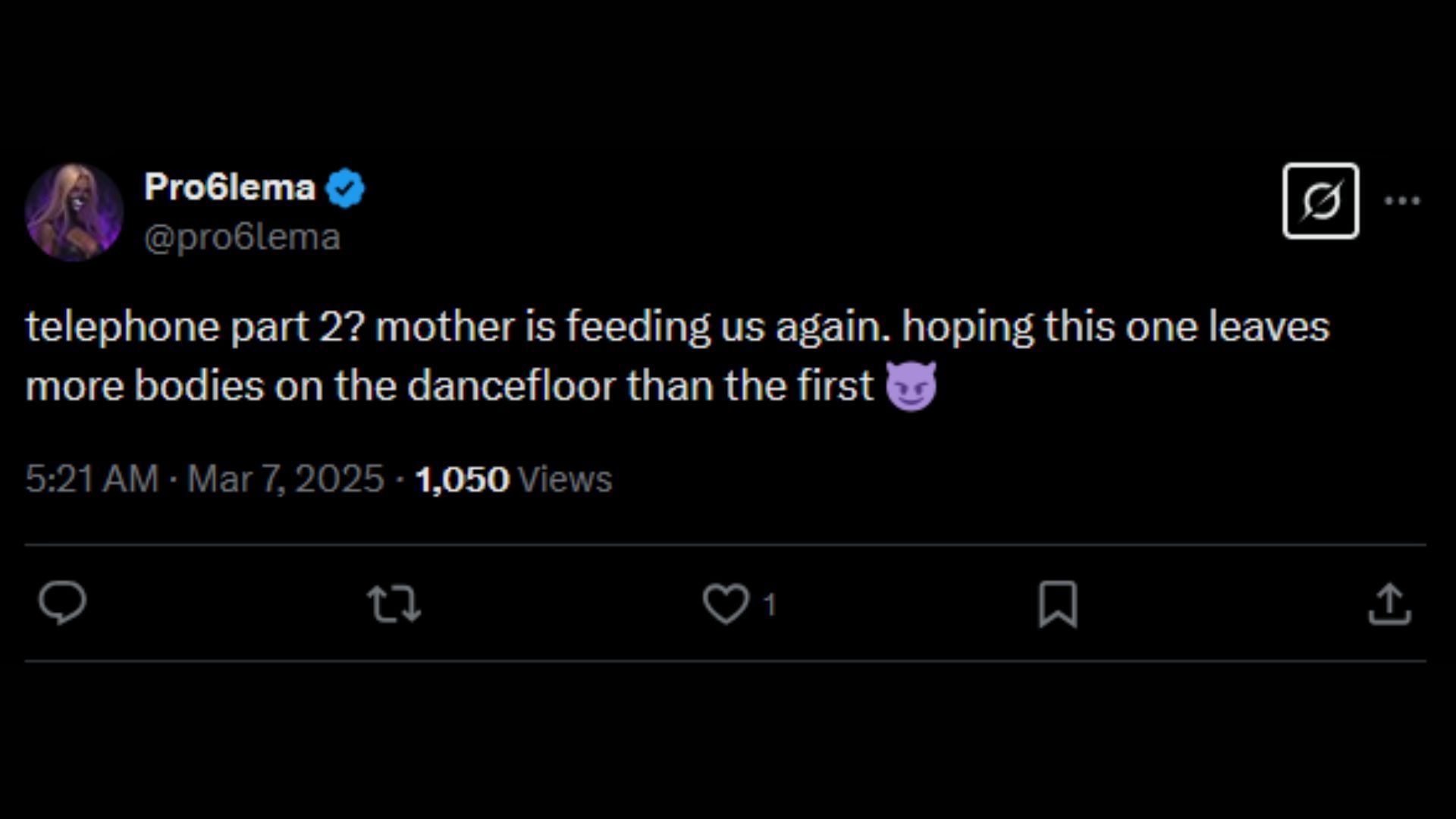 Another wrote: "telephone part 2? mother is feeding us again. hoping this one leaves more bodies on the dancefloor than the first"