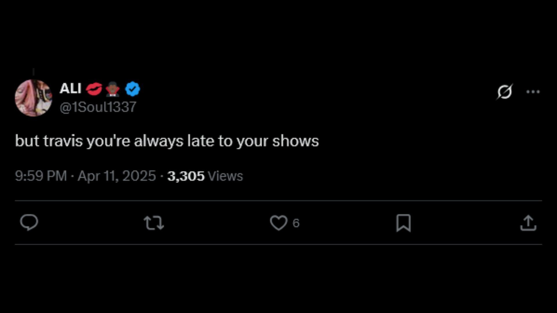 "But travis you're always late to your shows"