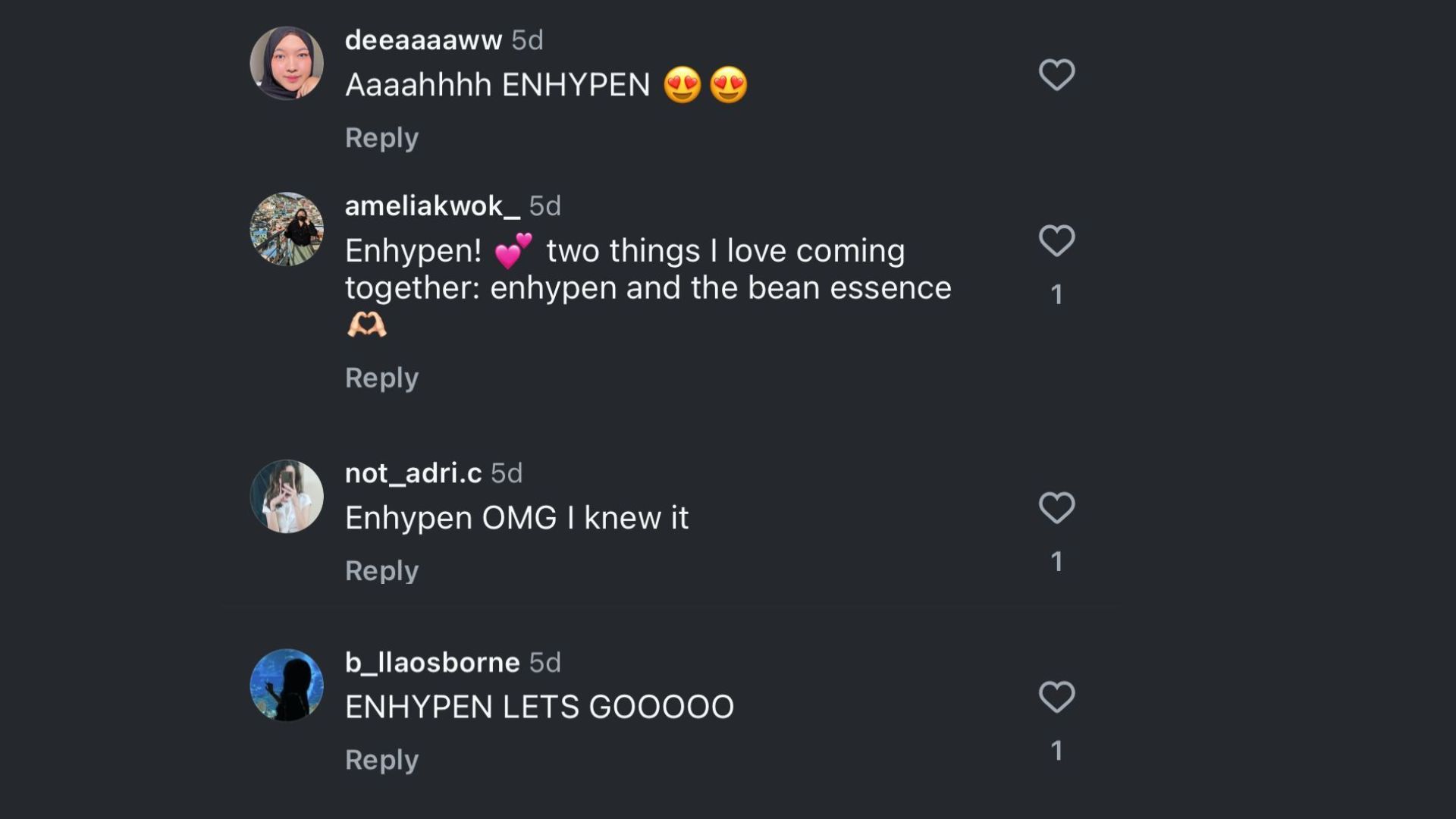 "ENHYPEN! Two things I love are coming together: ENHYPEN and the bean essence!"