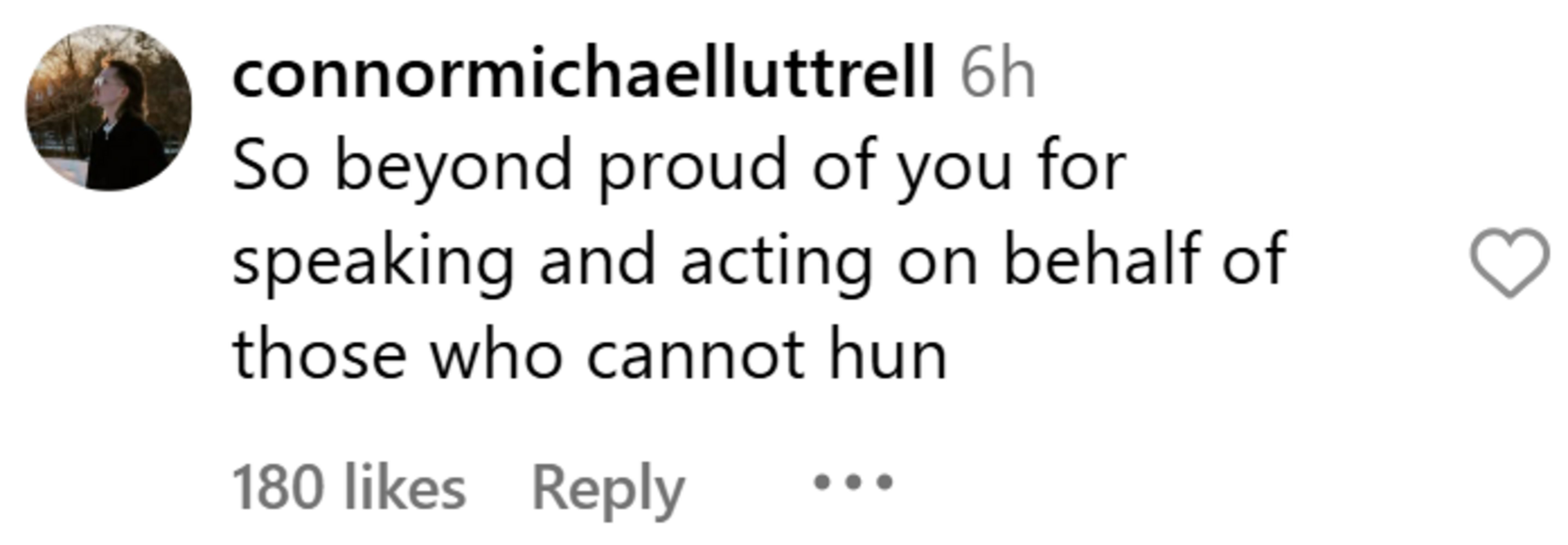 "So beyond proud of you for speaking and acting on behalf of those who cannot hun," another user, @connormichaelluttrell, posted.
