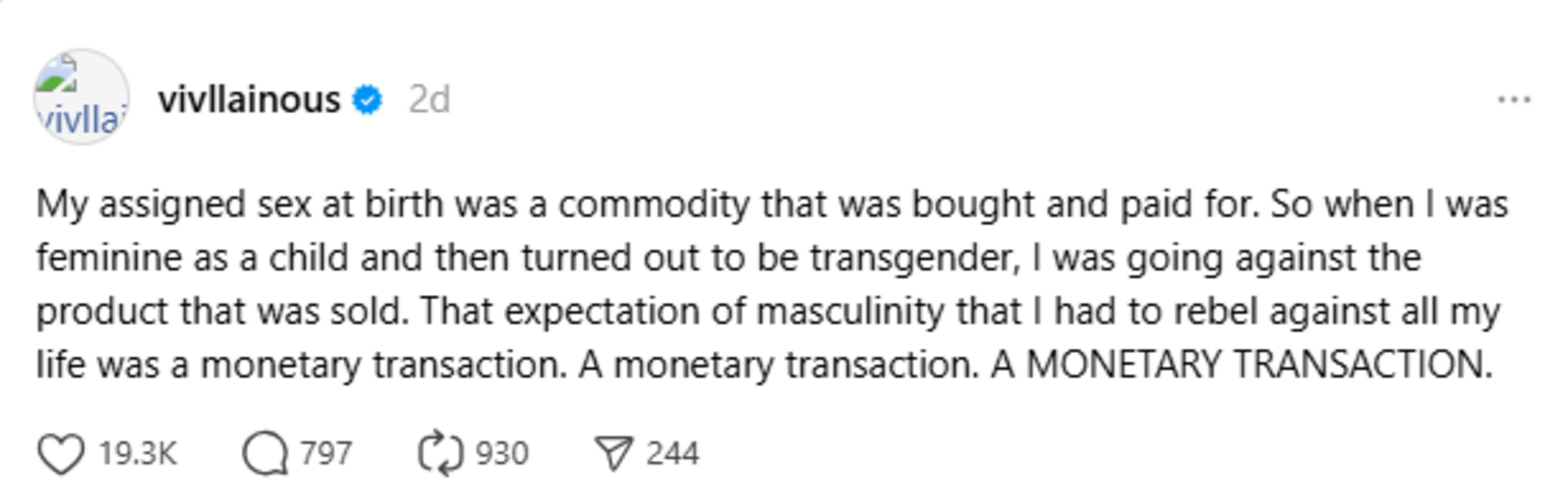 "My assigned sex at birth was a commodity that was bought and paid for. So when I was feminine as a child and then turned out to be transgender, I was going against the product that was sold. That expectation of masculinity that I had to rebel against all my life was a monetary transaction. A monetary transaction. A MONETARY TRANSACTION."