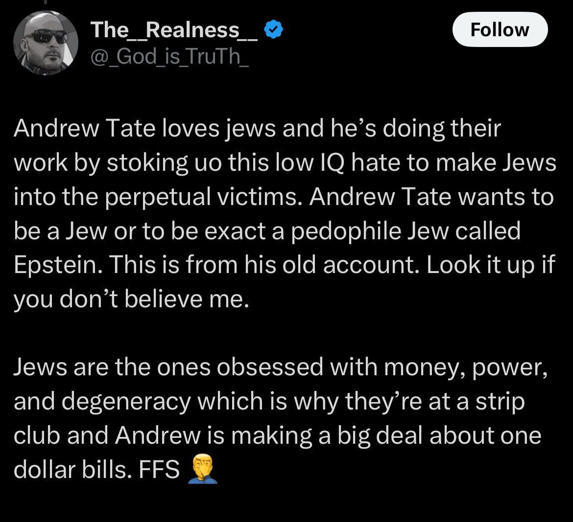 "Andrew Tate loves jews and he’s doing their work by stoking uo this low IQ hate to make Jews into the perpetual victims. Andrew Tate wants to be a Jew or to be exact a pedophile Jew called Epstein. This is from his old account. Look it up if you don’t believe me. Jews are the ones obsessed with money, power, and degeneracy which is why they’re at a strip club and Andrew is making a big deal about one dollar bills. FFS"
