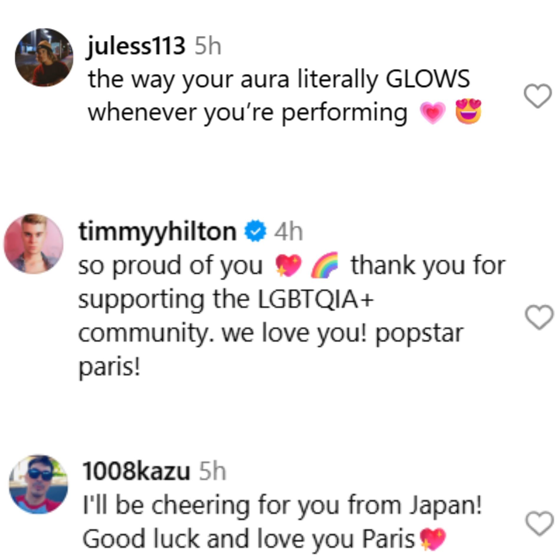 "so proud of you 💖🌈 thank you for supporting the LGBTQIA+ community. we love you! popstar paris!" another user, @timmyyhilton, wrote.