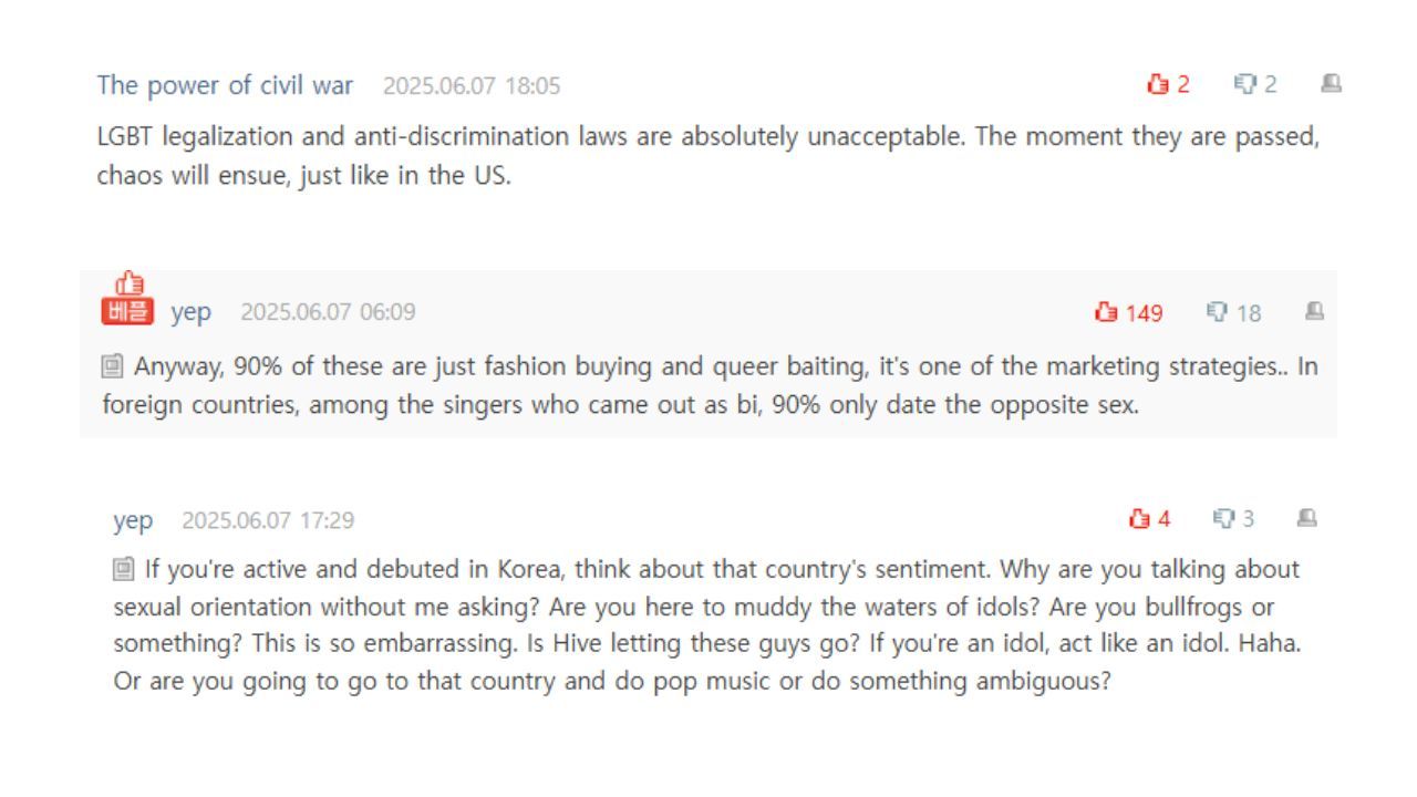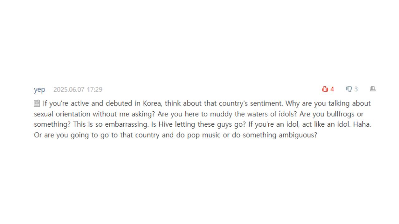 “If you're active and debuted in Korea, think about that country's sentiment. Why are you talking about sexual orientation without me asking? Are you here to muddy the waters of idols? Are you bullfrogs or something?” another Pann user stated.