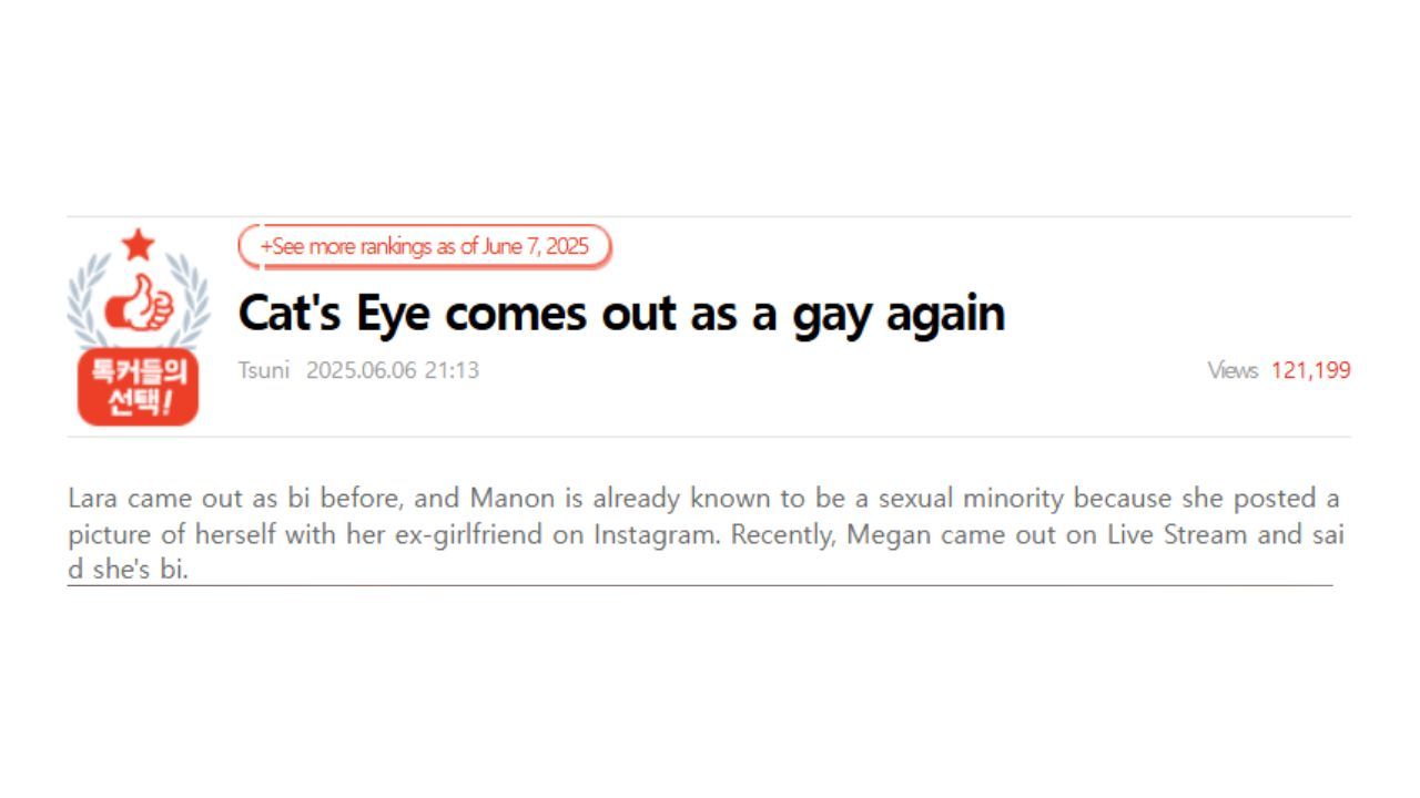 During her June 6 live broadcast on Weverse, while trying on wigs with fellow member Lara, Megan casually said, “Happy Pride Month,” to which Lara warmly responded. The exchange held deeper significance since Lara had come out as queer earlier this year in March.