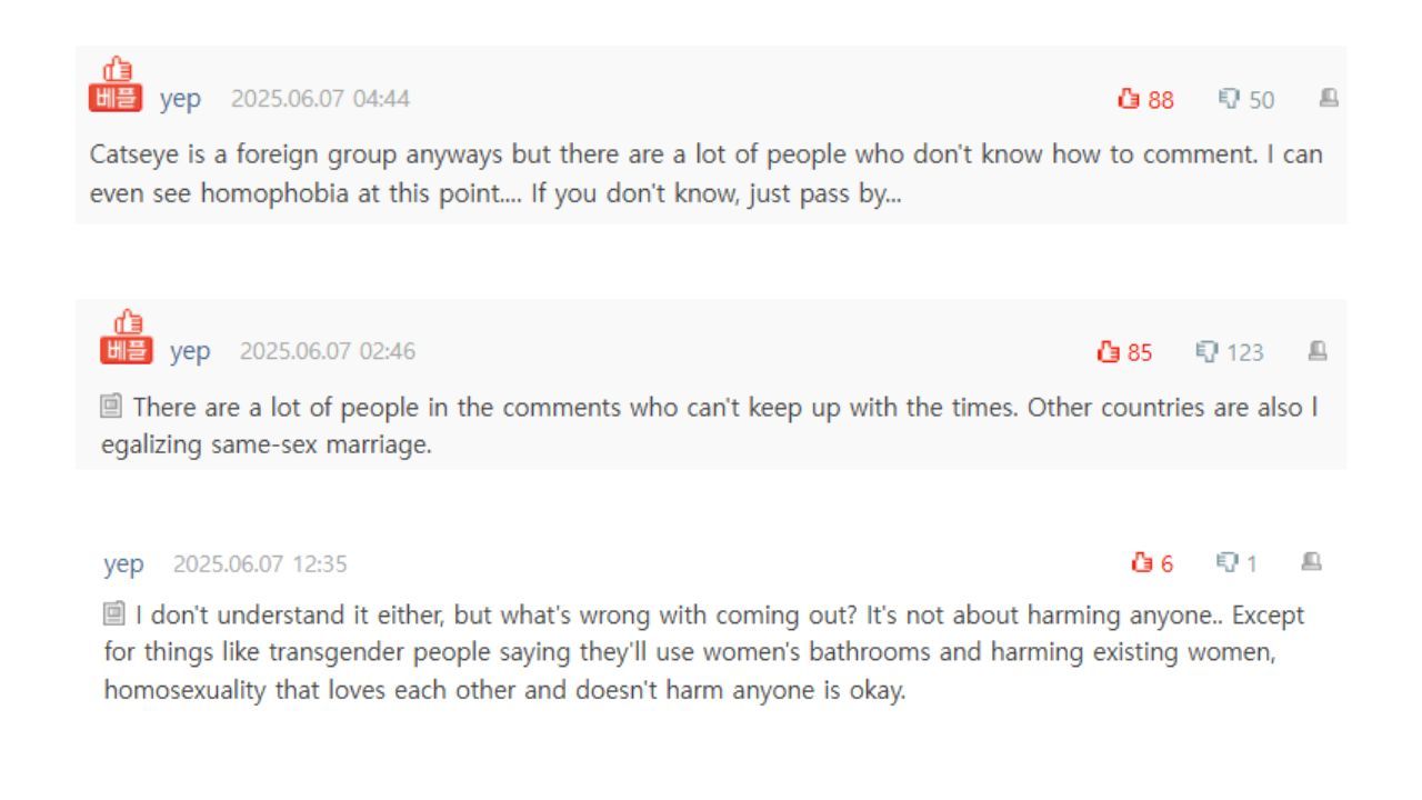 "KATSEYE is a foreign group anyways but there are a lot of people who don't know how to comment. I can even see homophobia at this point.... If you don't know, just pass by..." one user wrote.