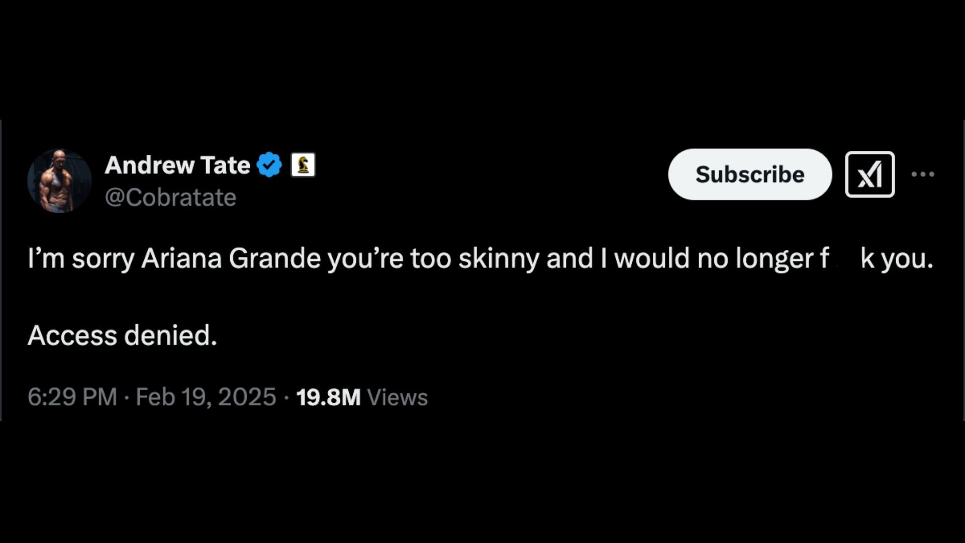 Andrew Tate's X post commenting on Ariana Grande's body has sparked outrage online. The singer is yet to respond to Tate's post.