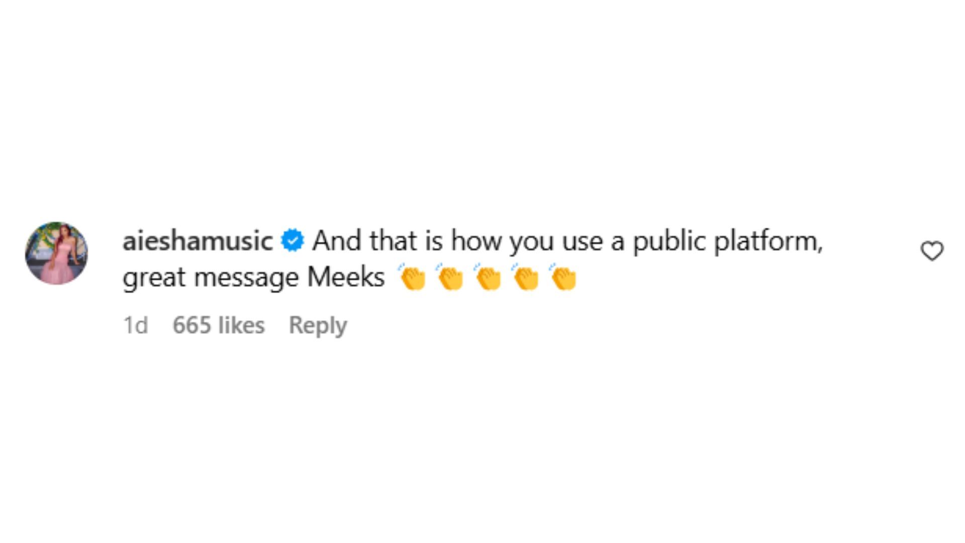 Meek Mill’s post got the attention of netizens. Many appreciated the way he used the platform to generate awareness. One Instagram user (@aieshamusic) commented: