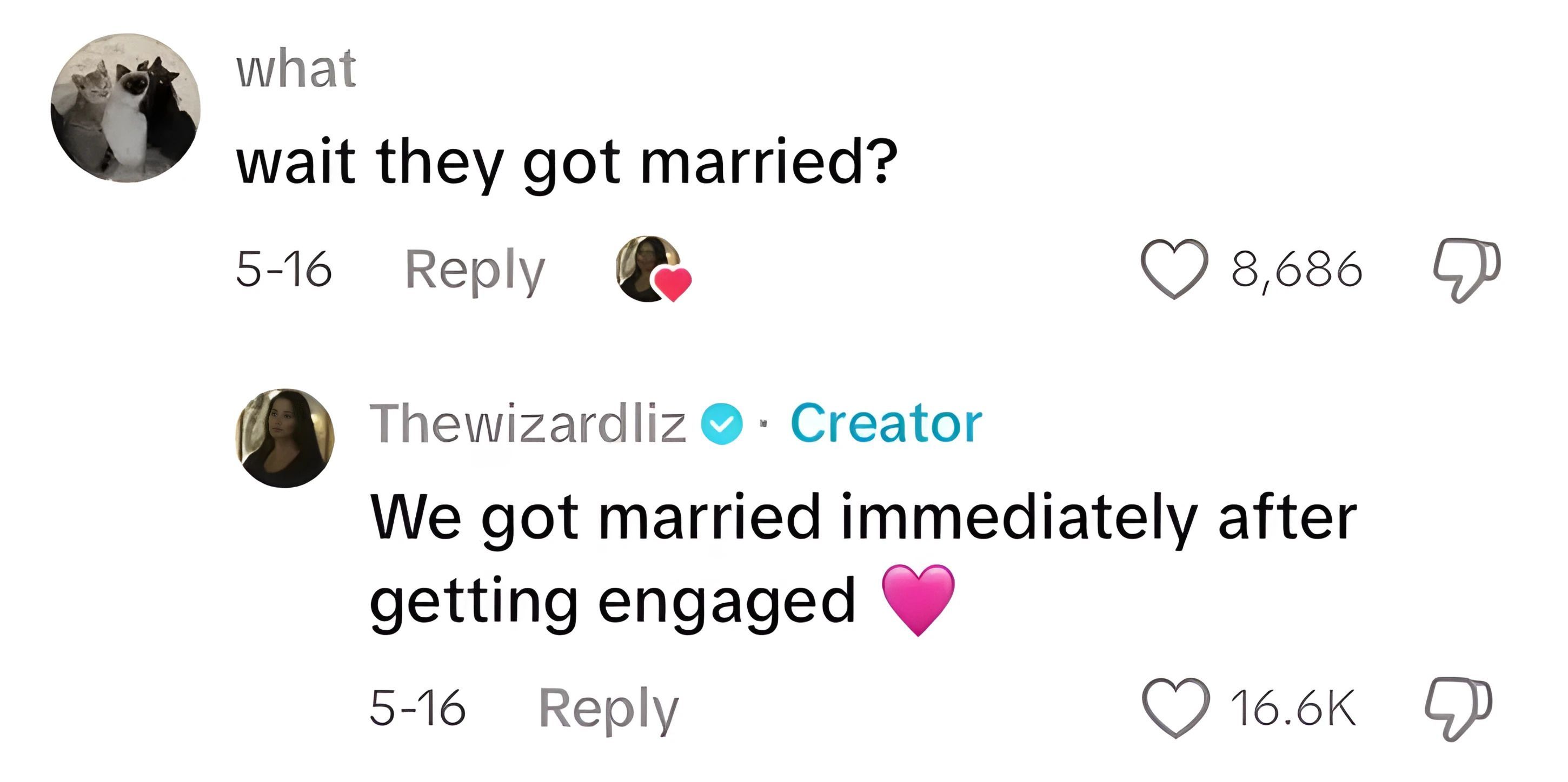 While an old comment where Liz confirms their marriage status shows,