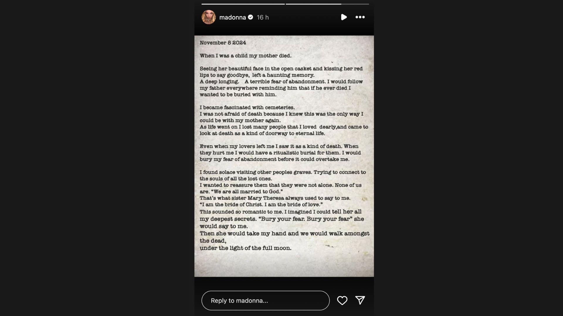 Some have speculated that the story behind this short film was inspired by Madonna's mother who passed away when she was just 30 years old due to breast cancer. The note on Madonna's Instagram story reads: