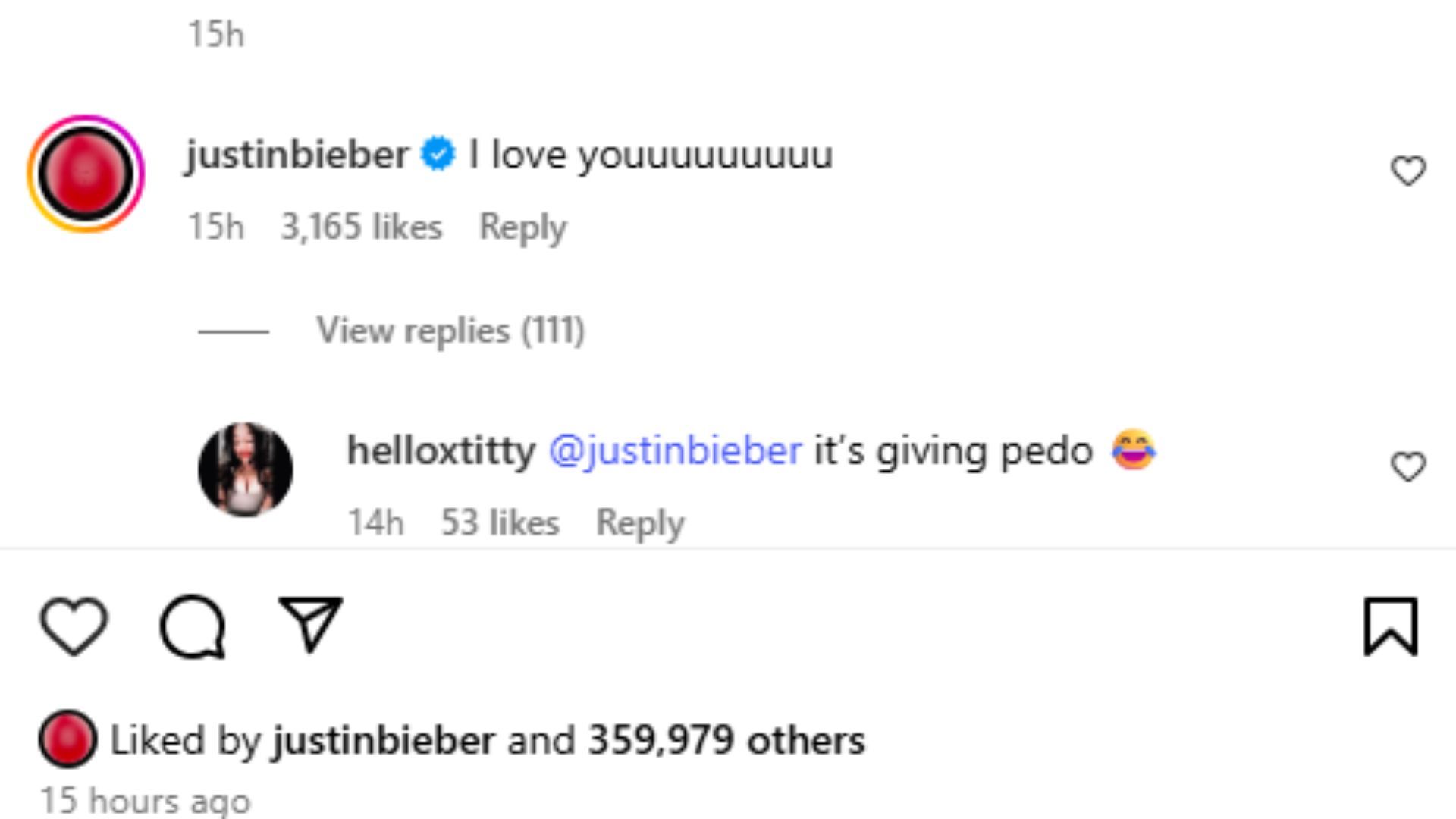 "It's giving pedo," an Instagram user commented on Justin Bieber's comment.