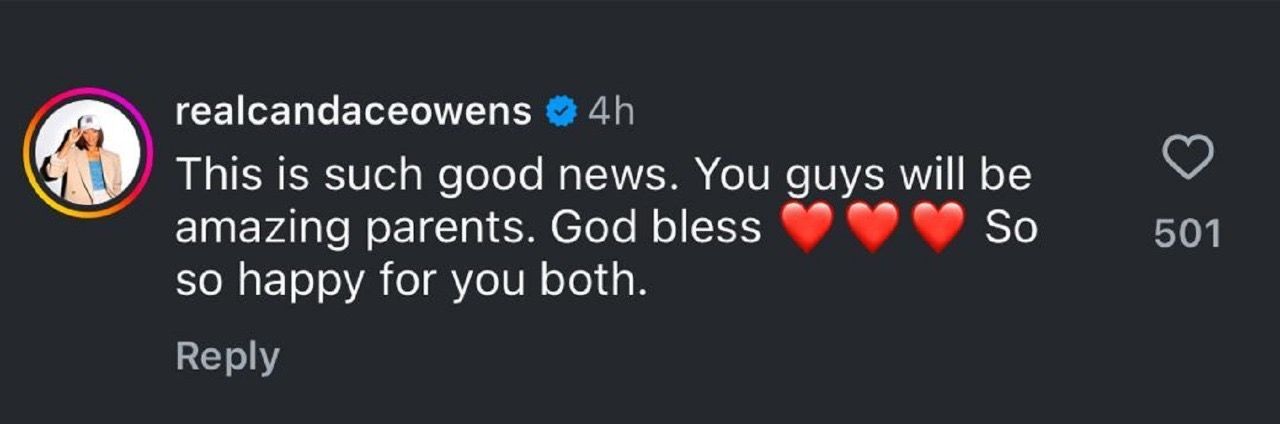 “This is such good news. You guys will be amazing parents. God bless. So happy for You both,” @realcandaceowens commented.