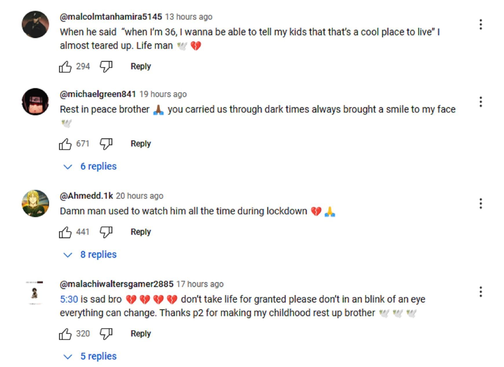 "5:30 is sad bro 💔💔💔💔 don’t take life for granted please don’t in an blink of an eye everything can change. Thanks p2 for making my childhood rest up brother 🕊️🕊️🕊️," wrote @malachiwaltersgamer2885.