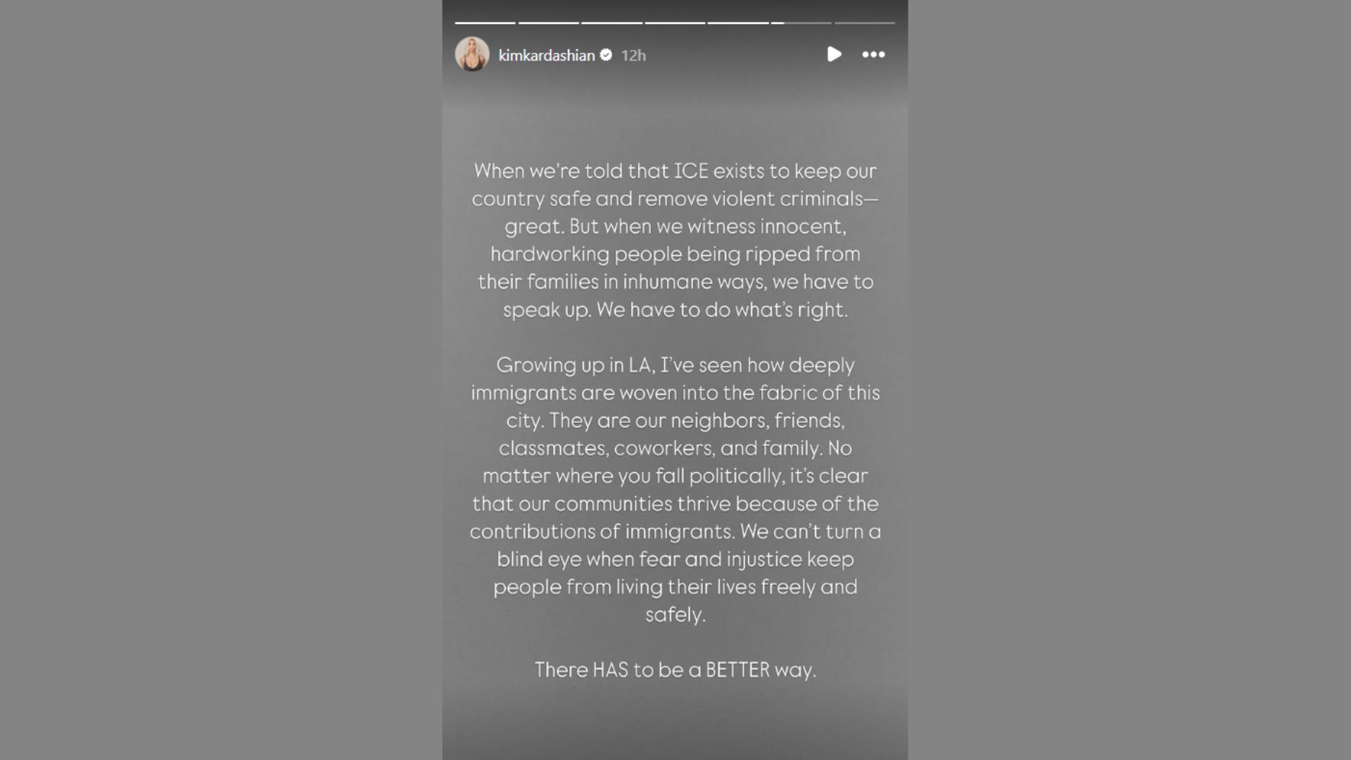 Kardashian reposted Grammy-winning rapper Doechii's emotional speech at the 2025 BET Awards. Doechii's statement criticized the deployment of the military against protestors and the militant response to the protests.