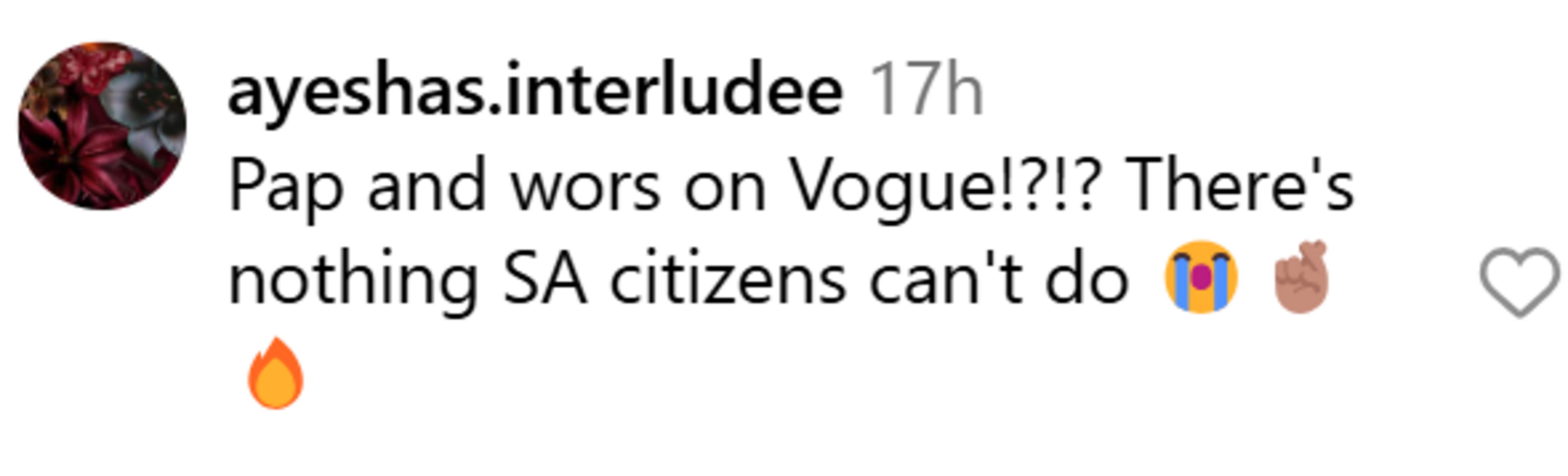 "Pap and wors on Vogue!?!? There's nothing SA citizens can't do 😭🤞🏽🔥," another user, @ayeshas.interludee, added.