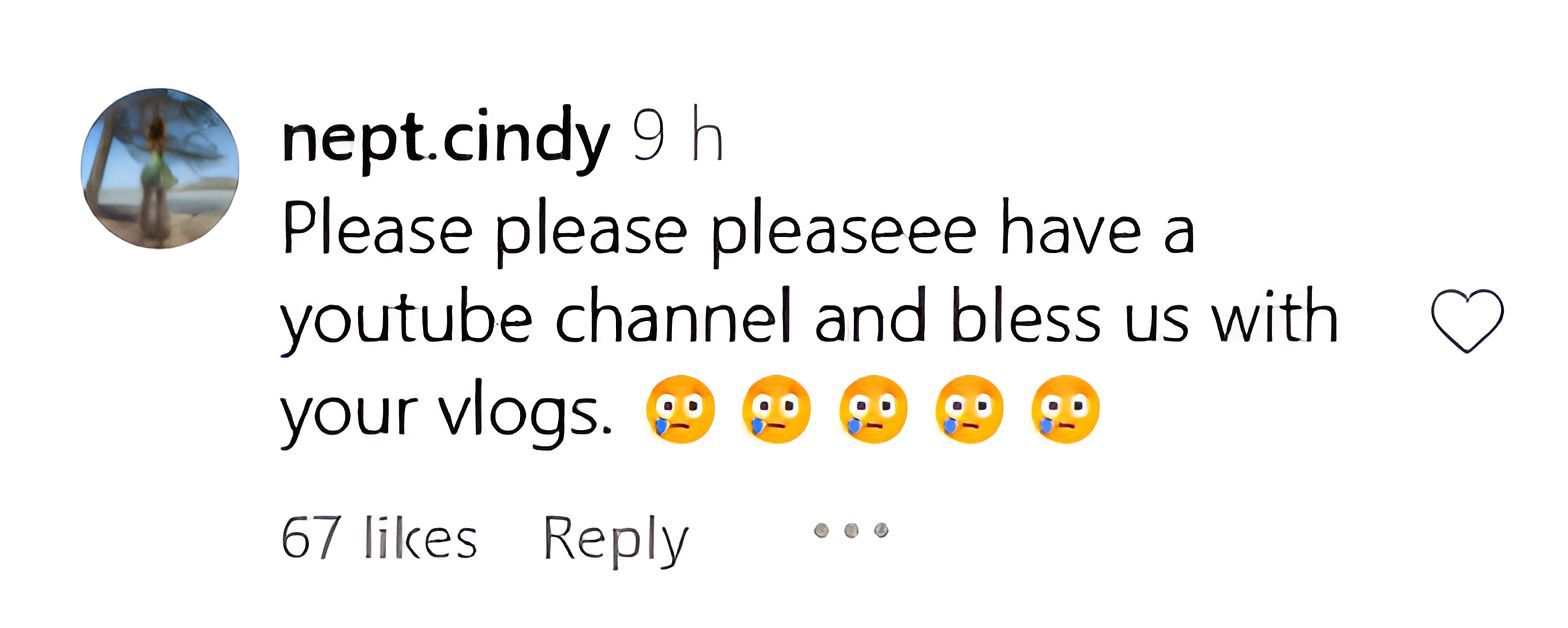 "Please please pleaseee have a youtube channel and bless us with your vlogs. 😢😢😢😢😢"