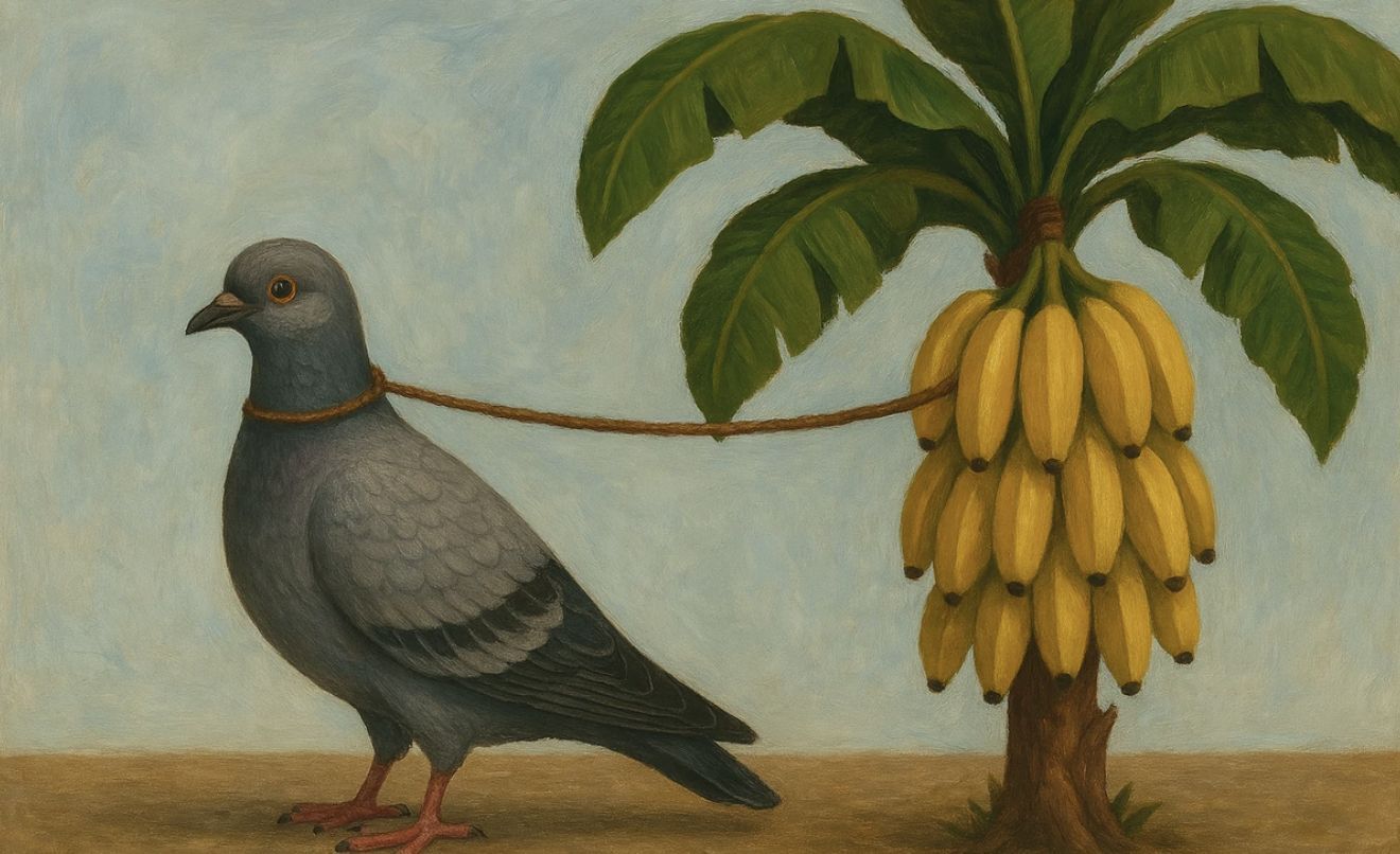 Pigeonito Prisonito Bananito of Indonesian Brainrot AI looks like a banana-shaped pigeon who sometimes flies in small broken loops. His body bends like rubber, and his wings barely flap in time with his movements. He never moves in straight lines. He knocks over leaders and shatters meetings without meaning to.