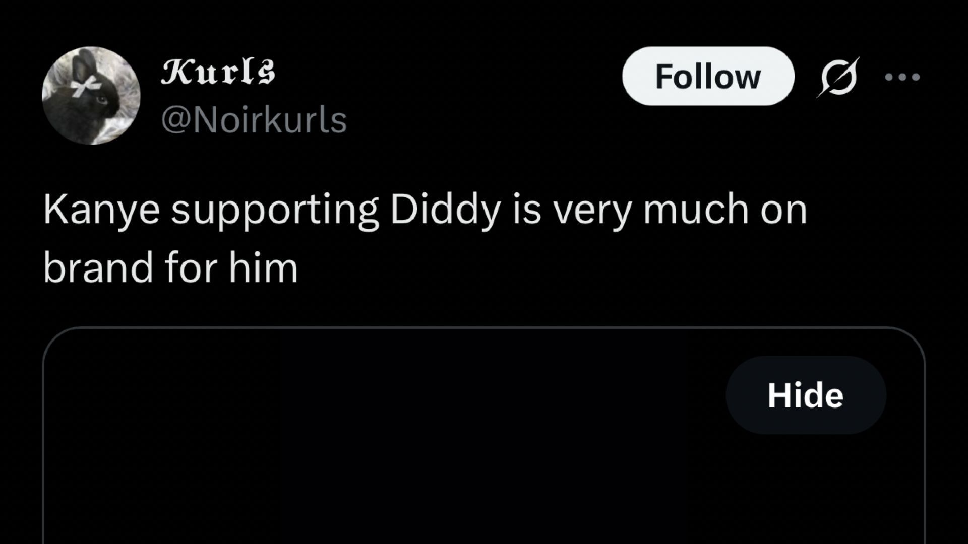 “I watched a documentary on Diddy's whole. How tf can a human being defend that? And the easy defence would be: "he's just trolling for attention", but remember, he was accused by a victim who said she almost got assaulted by ye and diddy in a studio. Honestly, f*** him.”