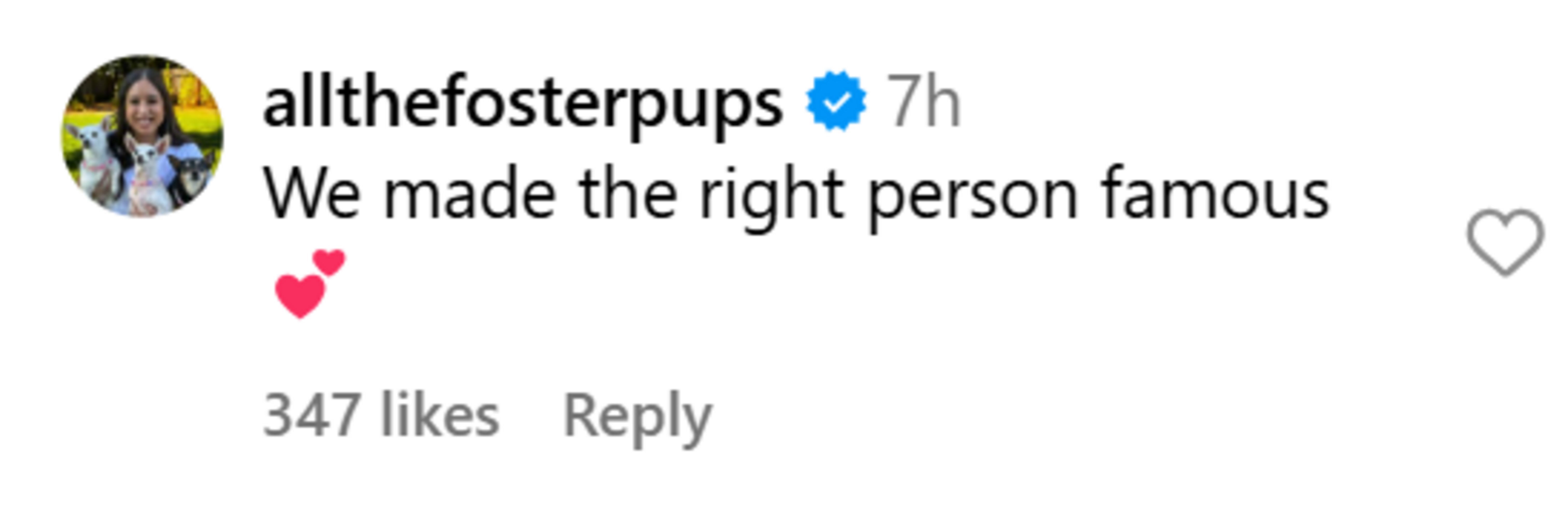 "We made the right person famous 💕," a user, @allthefosterpups, commented.