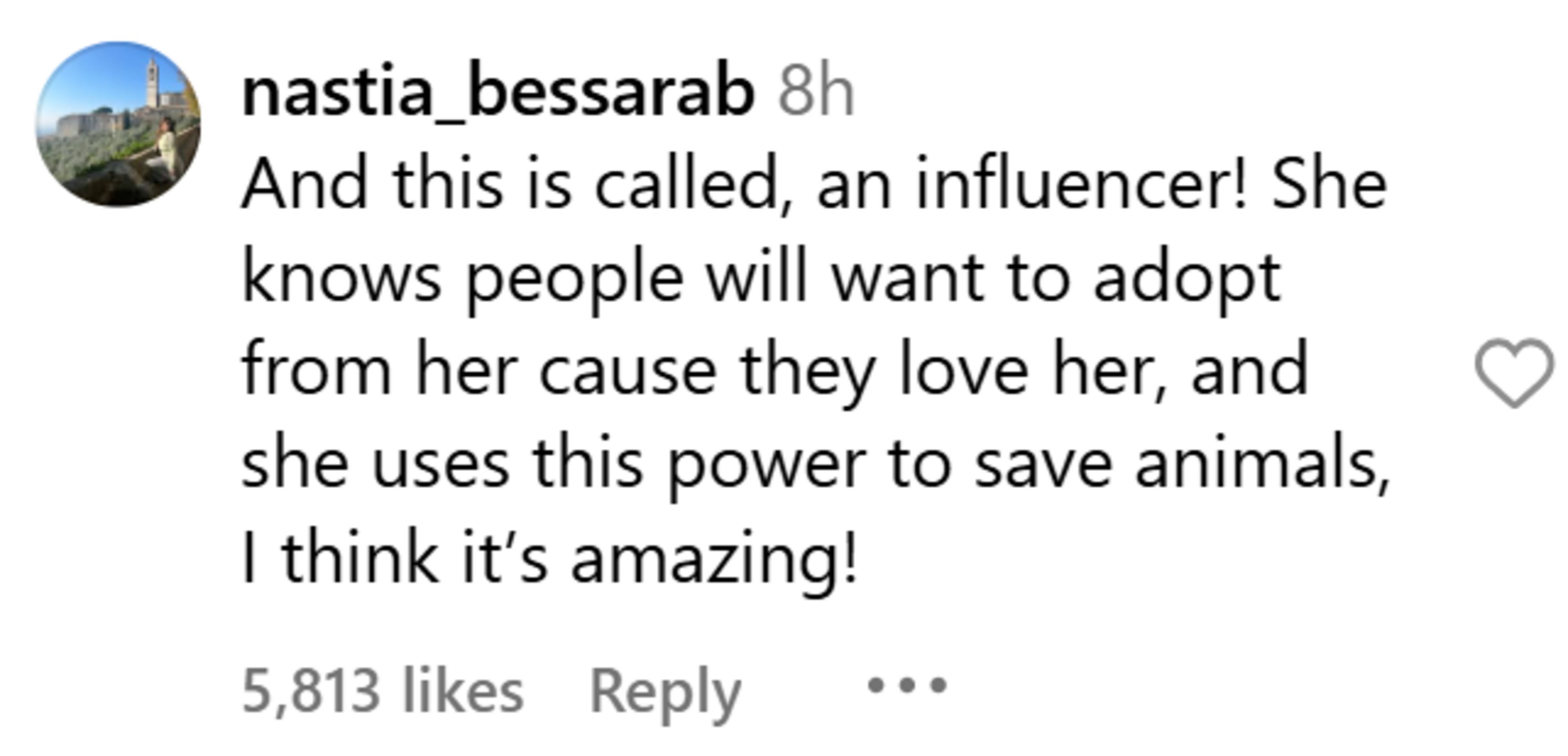 "And this is called, an influencer! She knows people will want to adopt from her cause they love her, and she uses this power to save animals, I think it’s amazing!" another user, @nastia_bessarab, wrote.