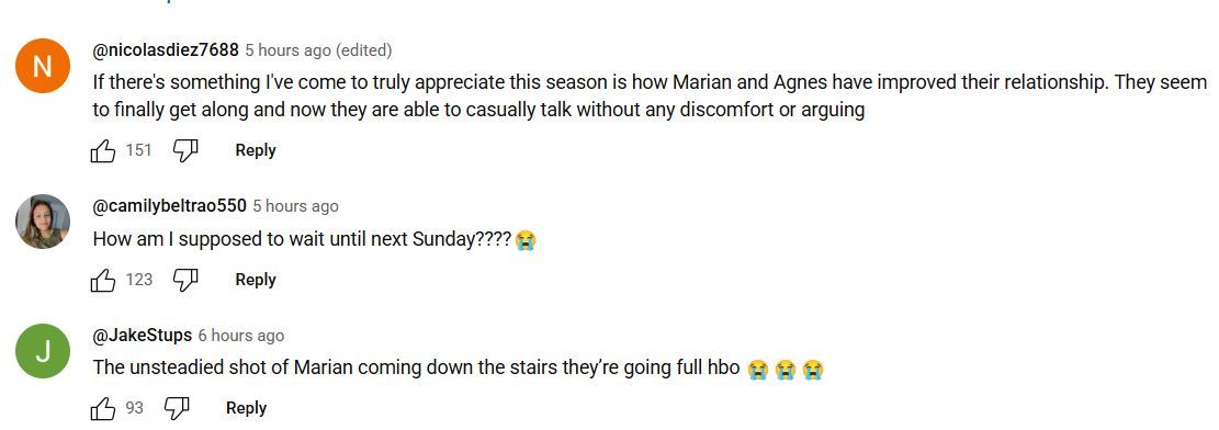 "If there's something I've come to truly appreciate this season is how Marian and Agnes have improved their relationship. They seem to finally get along and now they are able to casually talk without any discomfort or arguing"