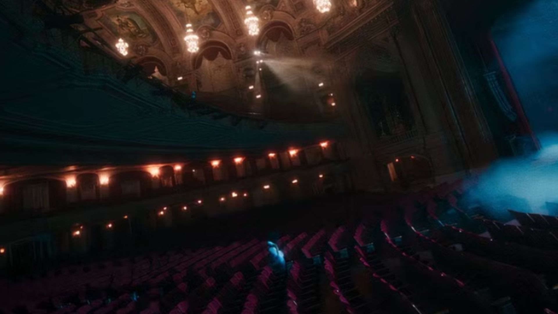 The next part of the nightmare shows her in a theatre, where the stage is covered with snow. Her hair is more natural here, showing that she is freer, more herself. When she tries to escape the theatre, Sydney realizes she is moving but staying in the same place — she cannot go forward and leave. This makes her panic, and there is a red glow that further hints at existing issues.