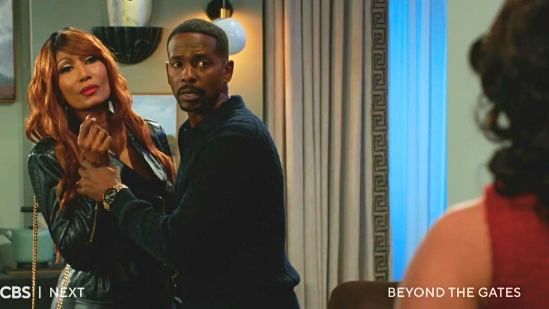 Kat (Colby Muhammed), not unlike Detective Jacob Hawthorne (Jibre Hordges), isn't going to leave a single stone unturned in her pursuit of answers and evidence to put Leslie (Trisha Mann-Grant) or Eva (Ambyr Michelle) or perhaps both behind bars. But Kat never expected to see this. Kat heads to the hotel where her father, Ted (Keith D. Robinson), has put up his newly acquired daughter Eva. Kat opens the door to the hotel room, and what a sight, there in the middle of the room is Leslie, wearing another one of her wigs and personalities. But what makes this all the more intriguing and shocking to Kat is the fact that her father is there too, and he’s got Leslie by the wrists. What has Kat walked in on? Ted told Leslie to stay away from him and his family. Was Leslie about to adopt another of her personalities to make another movie against him? Or was this an attempt to foolishly seduce Ted? Leslie believes that Ted still loves her, even if it’s buried deep down. Leslie is unraveling gradually, and the stage is set for another showdown. Last time Leslie came away with the win, but Team Richardson won't give up or go down without a fight. This week on Beyond the Gates is heating up!