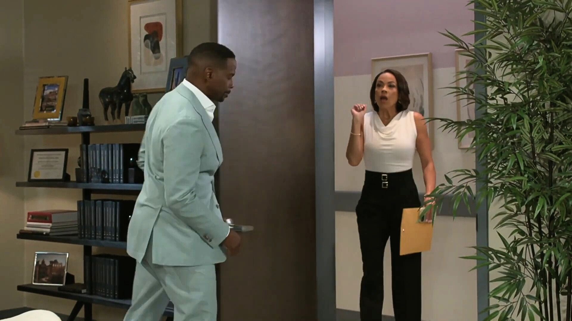 Ted (Keith D. Robinson) opens his office door to find a startled Nicole standing outside. She has a manila folder with her, and it all looks like official stuff. Nicole says, stammering a little, that she needs to do this. Ted, accepting what is, just says to Nicole, Let's get it done. Ted doesn't look happy about it, but it’s what Nicole wants, so he’s about to do it. Are these divorce papers? Is Nicole wanting to sell the house? Nicole has some life-changing news for Ted this week.