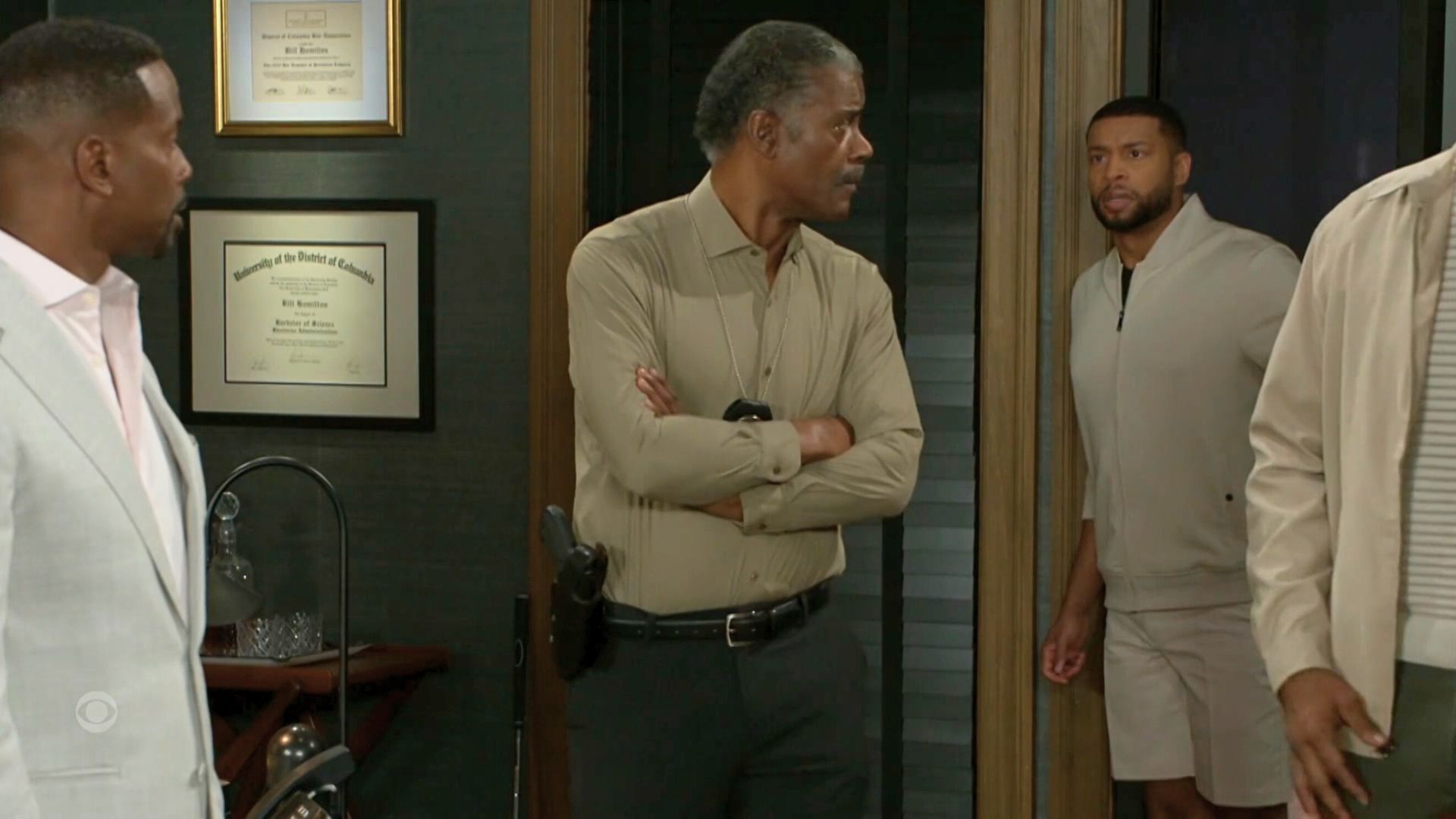 Now we are really building a picture of what happened two years ago with Martin (Brandon Claybon), and now we get to see a room full of all the players. Bill (Timon Kyle Durett) and Ted (Keith D. Robinson) (I know there is a joke to be made here), Joey (Jon Lindstrom), Marcel (Darryl W. Handy), Elon (Malachi Malik), Vernon, and Martin walk into Bill's office and see them all gathered here to discuss their mutual problem from two years ago. Martin is annoyed that Vernon has dragged his dad into this, but as Vernon soon explains, Ted has known about this from the start. Martin can’t believe his ears, but for us at home, we have already put two and two together, and could Ted have been the plastic surgeon who reconstructed a face after a beating?