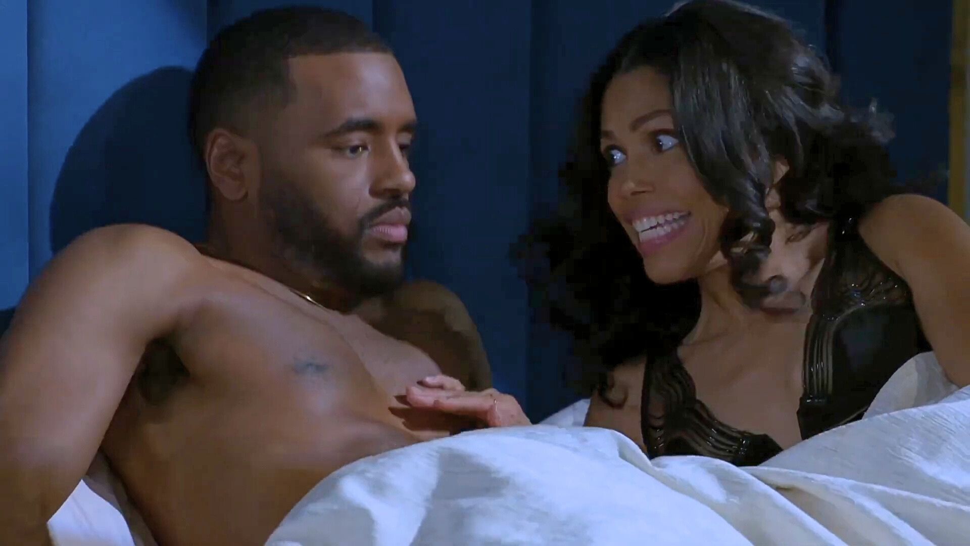 Dani (Karla Mosley) and Andre are enjoying some time together in bed, and assuming they are alone was a mistake. Why would they have privacy when no one knocks on doors and calls out before arriving, much less messaging or calling first? Dani and Andre are startled by Vernon (Clifton Davis) downstairs calling out to his daughter, “Dani…sweetheart?” How are Dani and Andre going to escape this situation? It would be funny if Andre came downstairs wearing a towel, but it is unlikely.