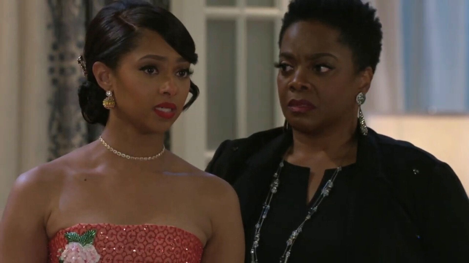 Everyone is gathered at the Country Club in Fairmont Crest for the big event, Ted and Nicole's Anniversary party, so we can safely assume Ted didn't get his wish to fly off to St Barts with his wife instead. Something has just happened and focusing on the table with Vernon (Clifton Davis) and Anita Dupree (Tamara Tunie) we see Vernon lean closer to Anita who looks very worried, says, “What in blue blazes.”
