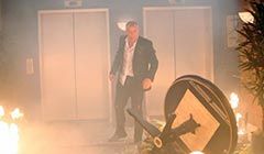 As Cane ascended the stairs, the person disguised as a devil approached from behind and hit Cane on the head. Cane fell down the stairs and remained unconscious as the attacker pulled him by his legs into an office. Ben exited the stairwell on an upper floor and attempted to summon an elevator. After Ben smelled smoke, he noticed smoke escaping beneath a door leading into the electrical room. Ben opened the door. A raging fire, fed by oxygen, quickly engulfed the area and blew out windows near the top floor of the structure.