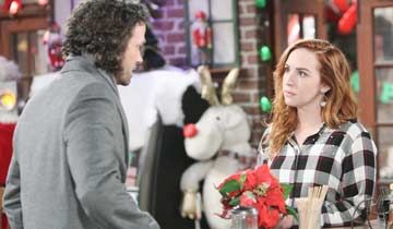 At Crimson Lights, Scott covered Sharon in kisses, but she insisted on getting back to work before they scared the customers. He kept kissing her, and she accidentally knocked over his mug of coffee. Sharon offered to get him coffee to go for his ride to the office, but Scott intended to work remotely for the rest of day, and he kissed her again. Mariah walked in and wondered if they could keep their hands and lips free long enough to get her a cup of coffee. Sharon suggested a holiday blend, but Mariah glared at Scott and pointedly stated that she liked to stay loyal and faithful to one kind of coffee.