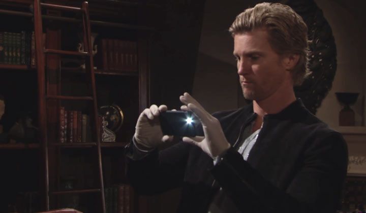 Reed suggested that he and J.T. check out what was on television, but J.T. insisted on returning some work calls first. J.T. headed upstairs, put on his gloves, and crept into Victor's study. He opened the credenza to expose the safe and pulled out an electronic safecracking device. J.T. rifled through the safe's contents and found a key.