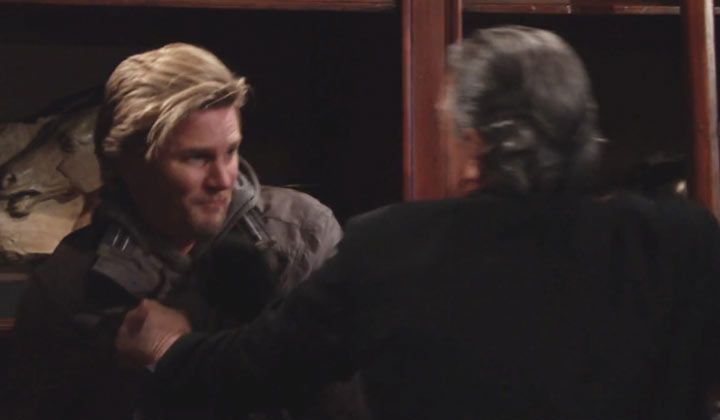 J.T. questioned why he should run, and he dared Victor to tell Victoria to stay away from him, since she wouldn't listen to her father. J.T. snarled that Victor had been the most important man in her life, but J.T. had become that man, since they'd gotten engaged after the incident on the video. Victor anticipated that Victoria would always stand with her family, and he threatened to ensure that J.T. lost everything if he stayed in town. Victor vowed to see to it that J.T. spent the rest of his life in absolute misery, and he bellowed that J.T. had lost because he was a loser and always would be. J.T. took a swing at Victor, but Victor dodged it and pummeled J.T., throwing him across the desk.