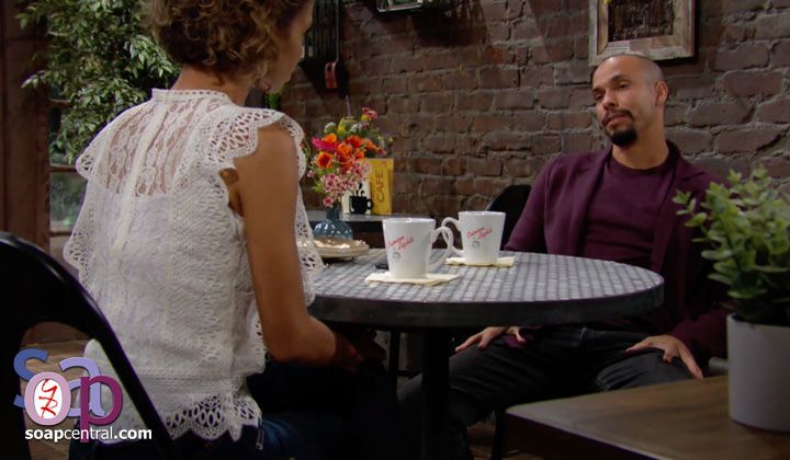 Devon struggled with what to do about Amanda's request. Elena recommended that he take some time to process it, stressing that it was perfectly okay if his answer was no. Devon thanked her for giving him clarity and support and for showing him love every single day. He murmured that he didn't know what he would do without her, and they exchanged words of love. He kissed her forehead and headed to the counter to order refills. She looked at the wedding photo on his phone again and looked worried.