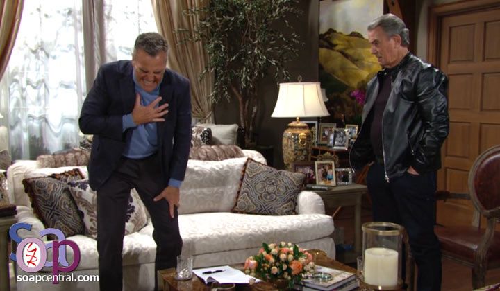 At the Newman ranch, Ashland complained about chest pain. Victor taunted that he'd dialed 9-1-1, and all he had to do was push send. Ashland begged him to do it, and Victor reiterated that he'd call the paramedics once Ashland signed the contract. Ashland accused Victor of risking Ashland's life, but Victor huffed that Ashland had done it to himself. Victor contended that they'd had a deal, and no one reneged on a deal made with him, so all Ashland had to do was honor the contract. Ashland grimaced in pain.